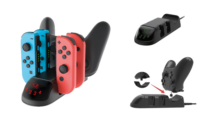 它可以同时为4个Switch Joy-Con 小手柄+1个Switch Pro手柄充电