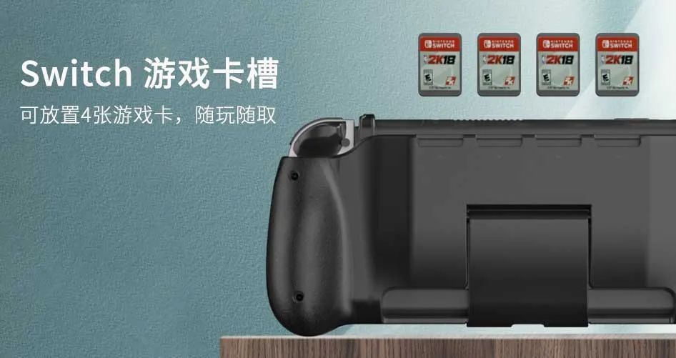 这款主机握把它不仅仅只是一个握把,它还有收纳功能哦!在它的背部有四个游戏卡槽,可同时收纳四张Switch游戏卡带,有了它,游戏卡就能随机携带了!