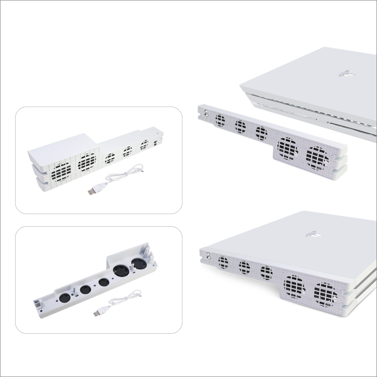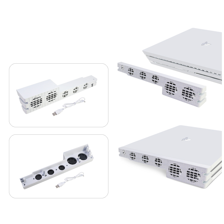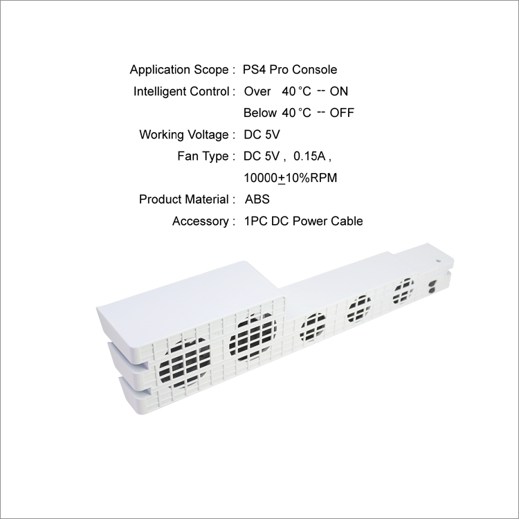 1. 适用范围:适用于PS4 Pro主机 2. 工作电压:DC5V 3. 风扇规格:DC5V 0.15A,转速10000±10%RPM 4. 产品材质:ABS料 5. 产品配件:DC电源线一条