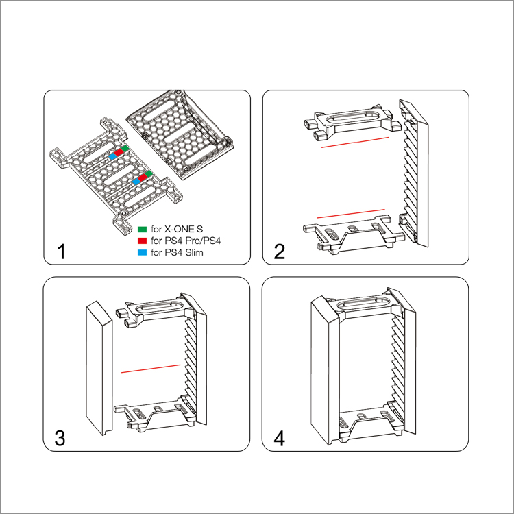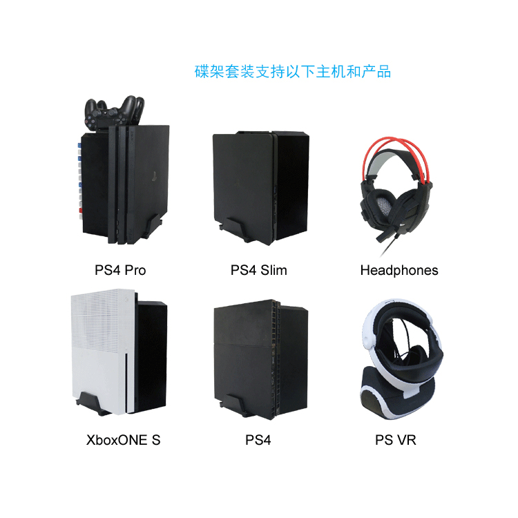1. 放置PS4 / XboxONE S游戏光盘盒。 2. 放置XBOX ONES,PS4,PS4 SLIM 和PS4 PRO主机。 3. 材料:ABS黑色壳料。 4. 可放24张游戏光盘盒。 5. 外部可同时外挂VR眼镜。