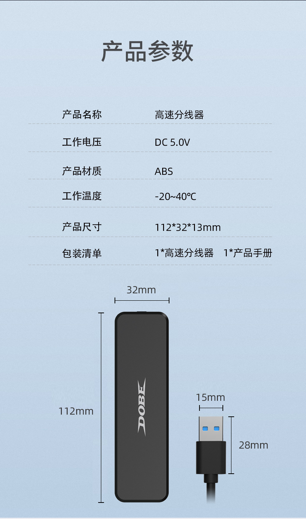 工作电压:DC 5.0V 产品材质:ABS 工作温度:-20~40°C 包装清单:1*高速分线器;1*产品手册