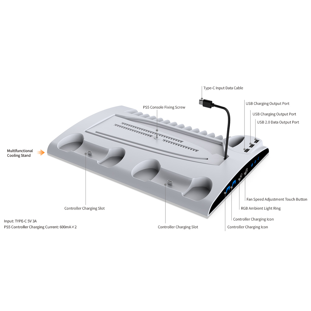 多功能集成:这款产品集成了PS5主机散热、PS5手柄充电功能于一身,为用户提供了便捷的一站式解决方案。