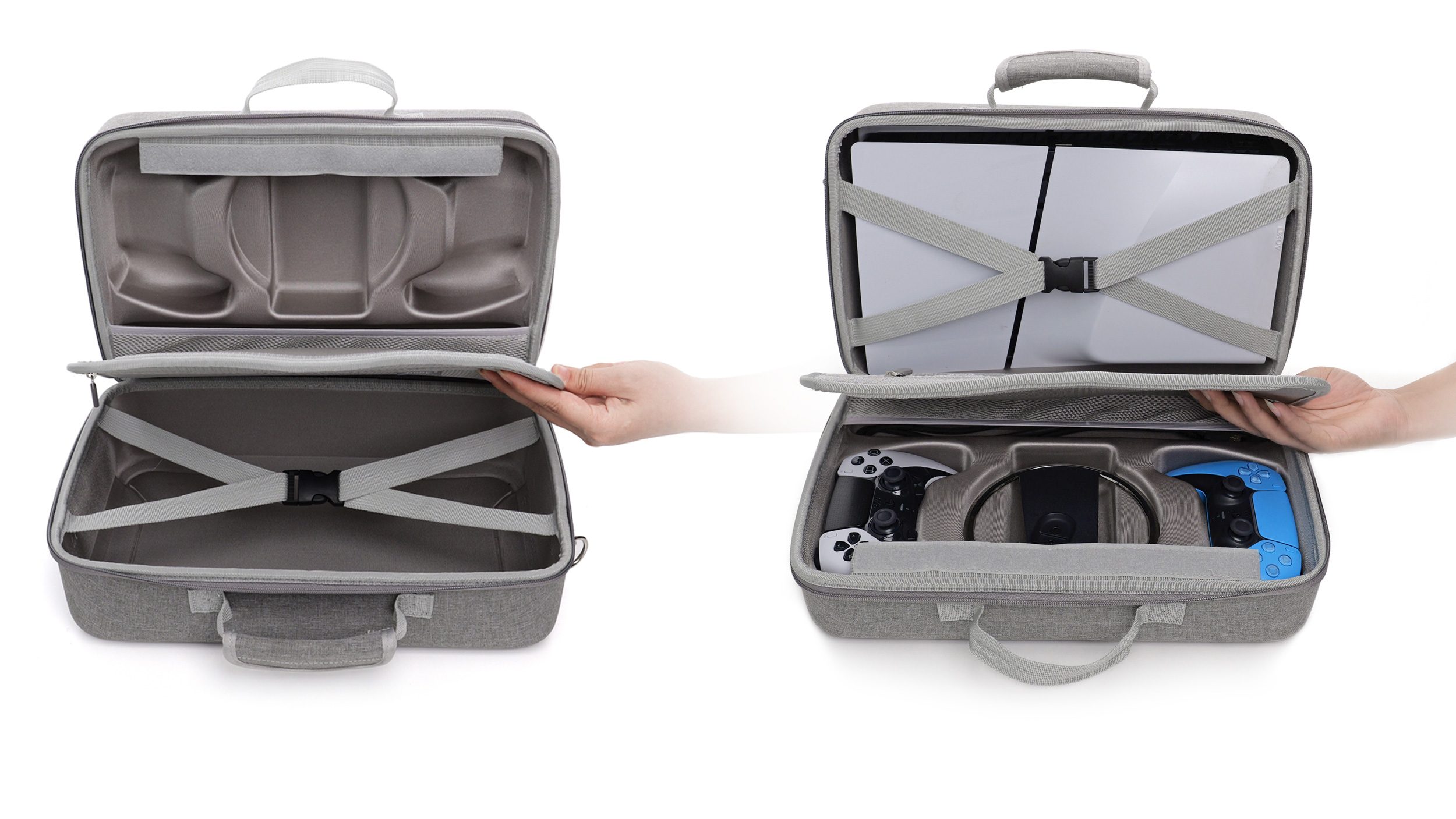 这款PS5 Slim收纳包,专为满足玩家们的多元化需求而设计。它不仅能够轻松收纳PS5 Slim主机,无论您是偏爱光驱版还是数字版,都能找到属于自己的专属空间。同时,包内还精心设计有放置PS5手柄、线材及原装底座的区域,让您的所有游戏配件都能有序安放,告别杂乱无章。