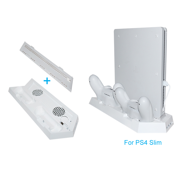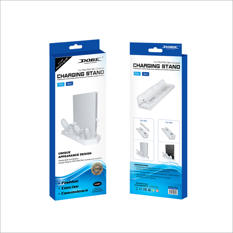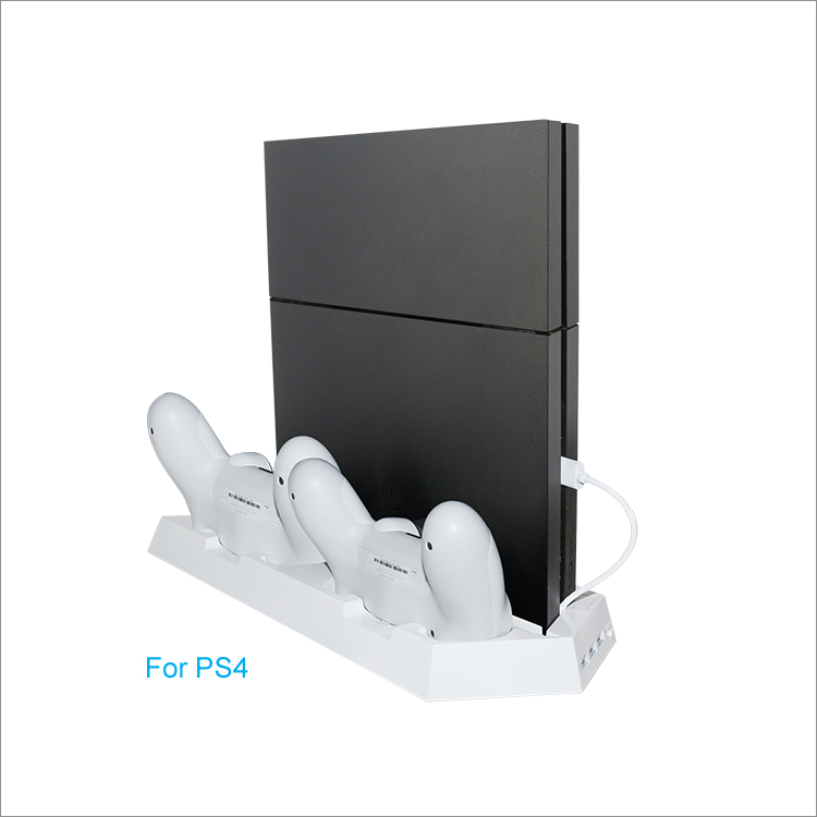 1. 适用于PS4主机和Slim主机,方便主机直立放置。 2. 可同时给主机散热降温。 3. 可同时给2个PS4原装手柄充电。