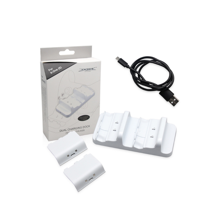 1. 适用于XBOX ONES无线控制器的双充电底座。 2. 电池容量:300mAH。 3. 包装内含一个充电底座、2个 300毫安电池、1条80cm的USB充电线。