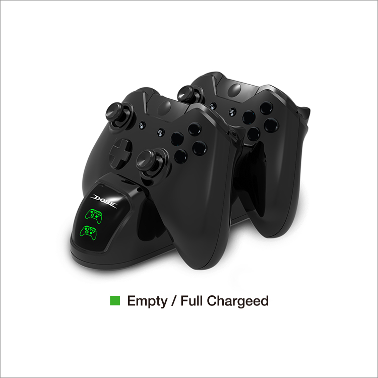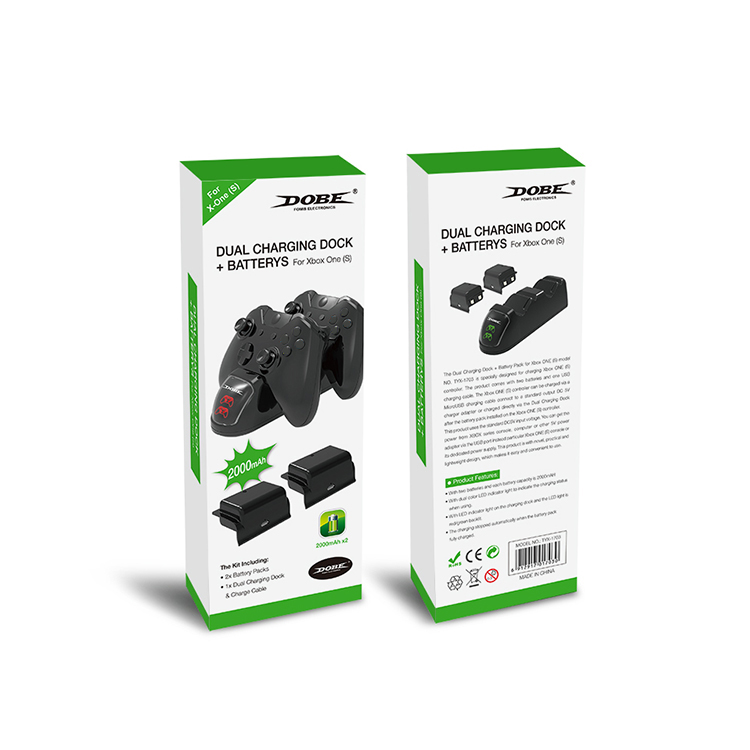 1. XboxONE S/X 通用手柄双充。 2. 含2个电池包,容量2000mAh。 3. 前面板带手柄图形充电指示灯,充电时显示红色手柄图案,充满/闲置时显示绿色手柄图案指示灯。