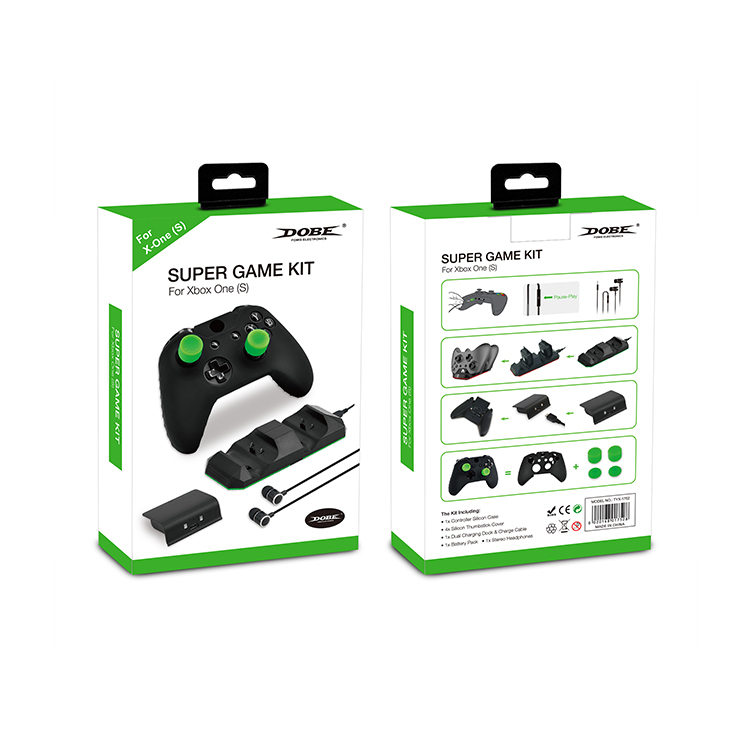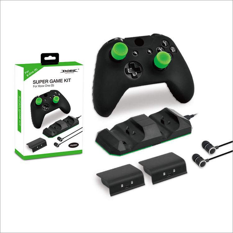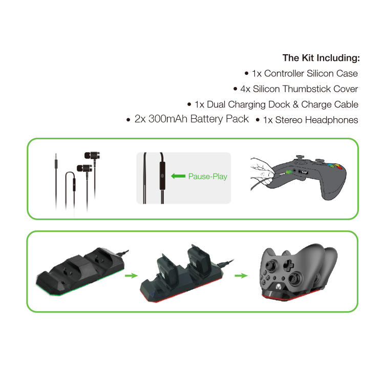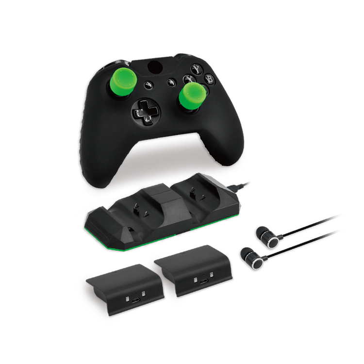 XboxONE S游戏套装,包含如下: 1. XboxONE(S)手柄硅胶套 1个 黑色 2. XboxONE(S)高脚摇杆帽 2个 绿色 3. XboxONE(S)普通摇杆帽 2个 绿色 4. 3.5mm 塑胶耳机 1个 黑色 5. 手柄双充含充电线 1个 黑 6. 手柄电池包300mAh 2个 黑