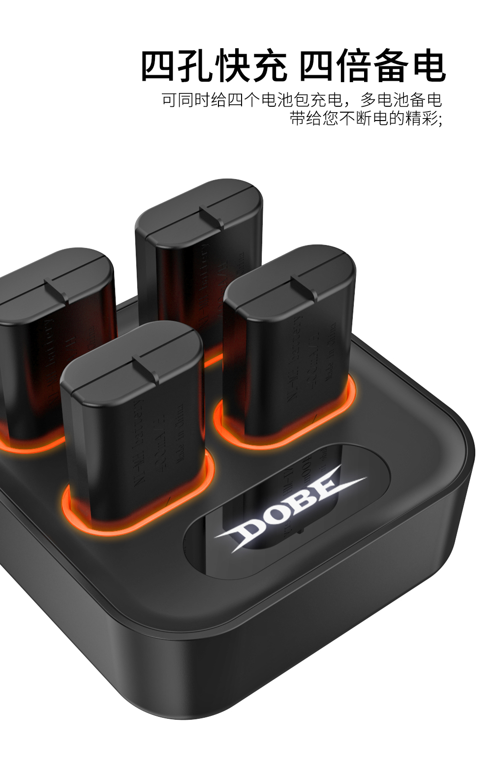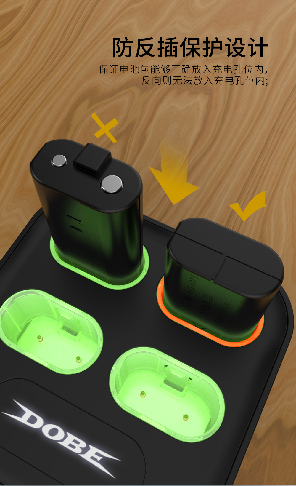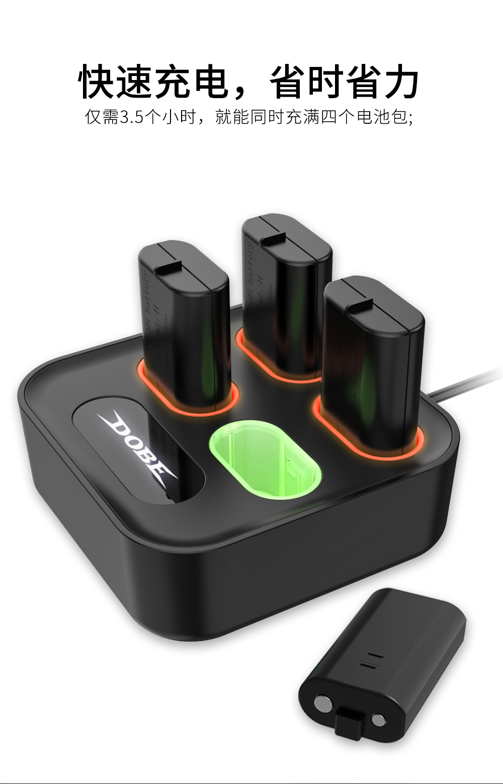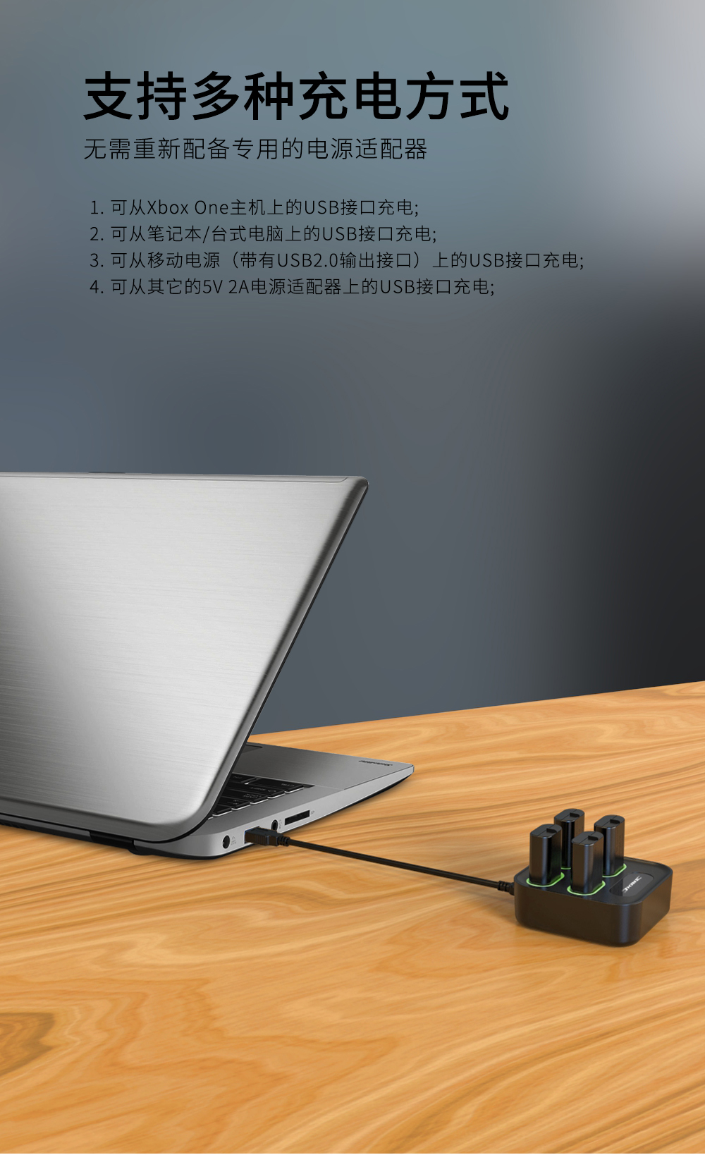 1. 可同时充4个XboxOne电池包,让游戏过程中电池包能量满满;