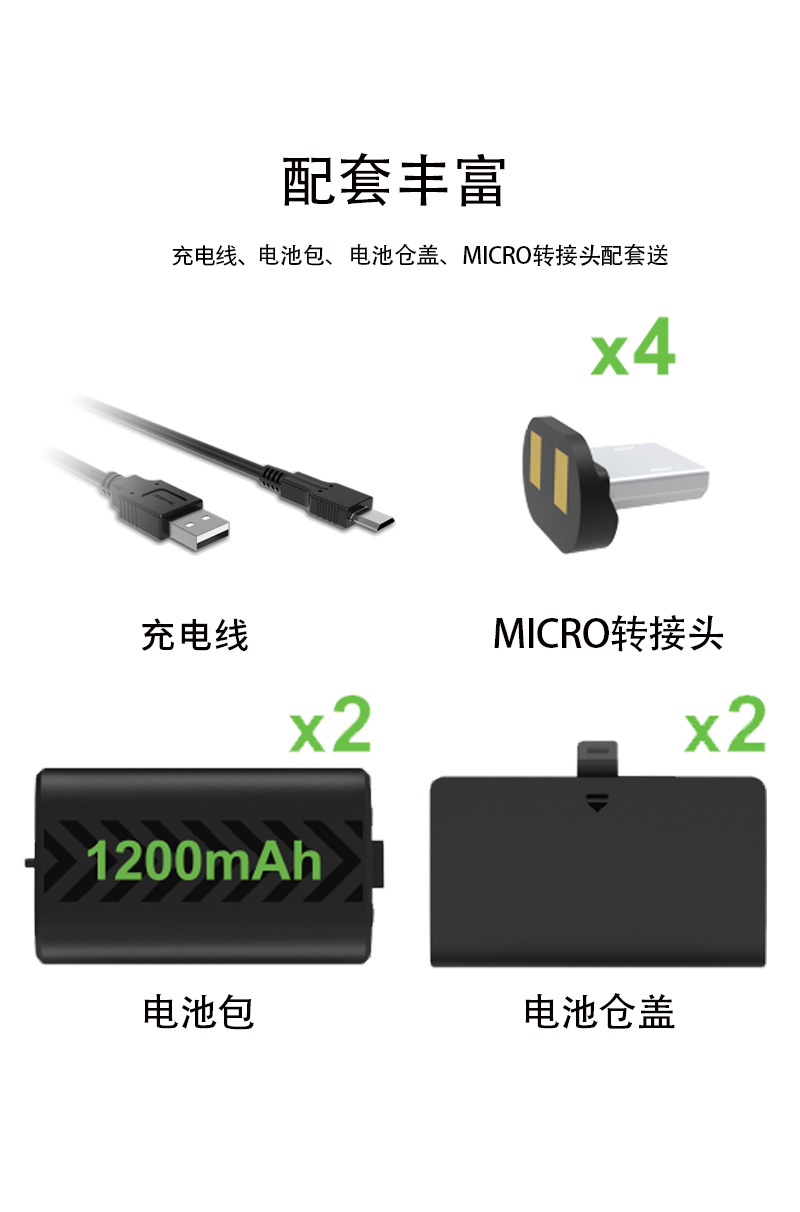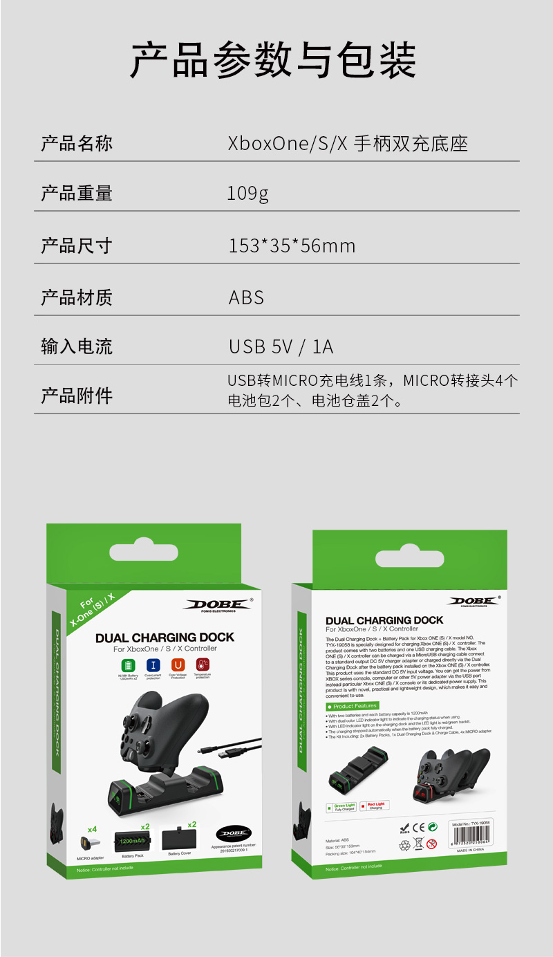 1. 可同时给两个XboxOne手柄充电 2. 产品充电电流:输入功率足够5V 1A 3. 产品供电:USB 5V/1A 4. 产品输出:5V 500mA*2 5. 充电时间:约2.5~3.5小时 6. 产品材质:ABS 7. 配件:USB转MICRO充电线1条,MICRO转头2个,电池包2个、电池仓盖2个。