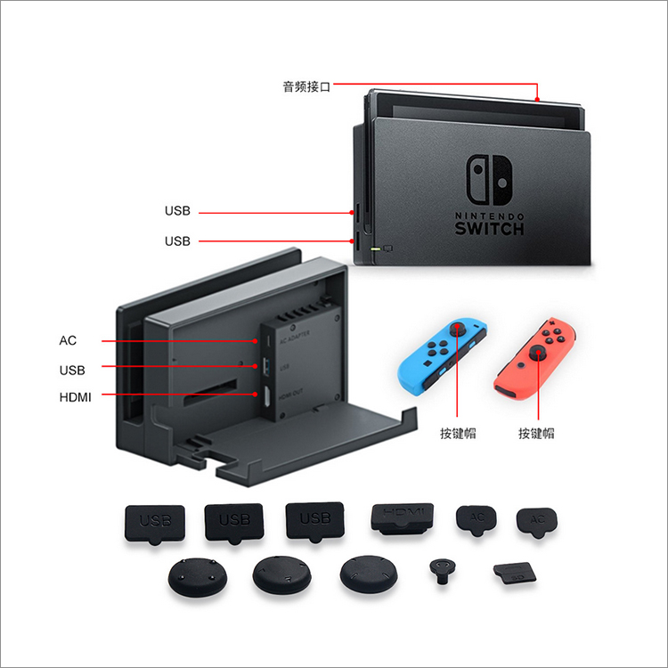 Switch防尘套装:含钢化玻璃膜1张 + 硅胶防尘塞1套 1. HDMI x 1 pcs; 2. USB x 3 pcs; 3. AC x 2 pcs; 4. 3D x 3 pcs 5. SD x 1 pcs; 6. 耳机塞 x 1 pcs; 7. 保护装饰条 2 pcs。