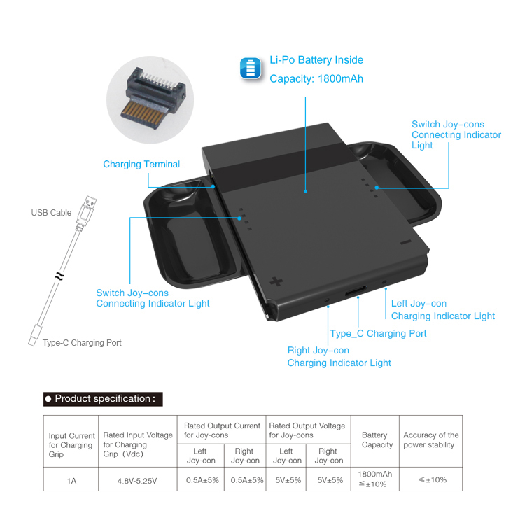 1. Switch充电手把,可同时给左右小手柄充电; 2. 含认证锂电,容量1800mah; 3. 背壳带4个电量指示灯,TYPE-C接口,兼容原装充电器,充电线长80cm; 4. UN38.3/MSDS/空运/海运认证证书
