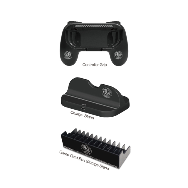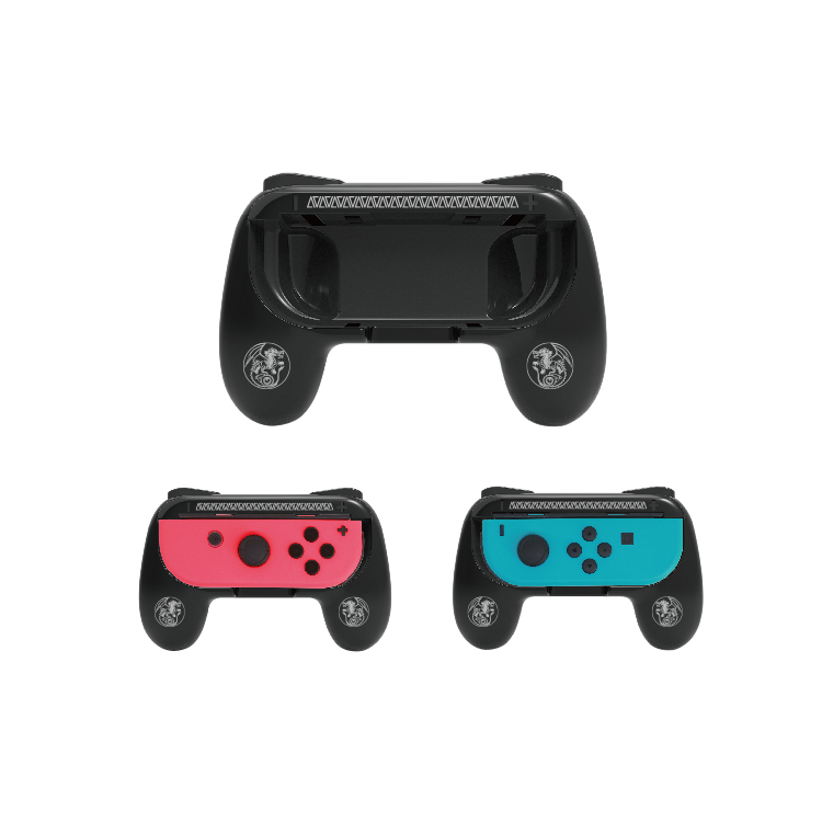 1. Switch 猎人套装,针对怪物猎人游戏而开发。 2. 由Switch小手柄握把1个,主机座充1个,游戏卡盒支架1个组合而成,均含有猎人游戏简易图腾图案,简洁大方。