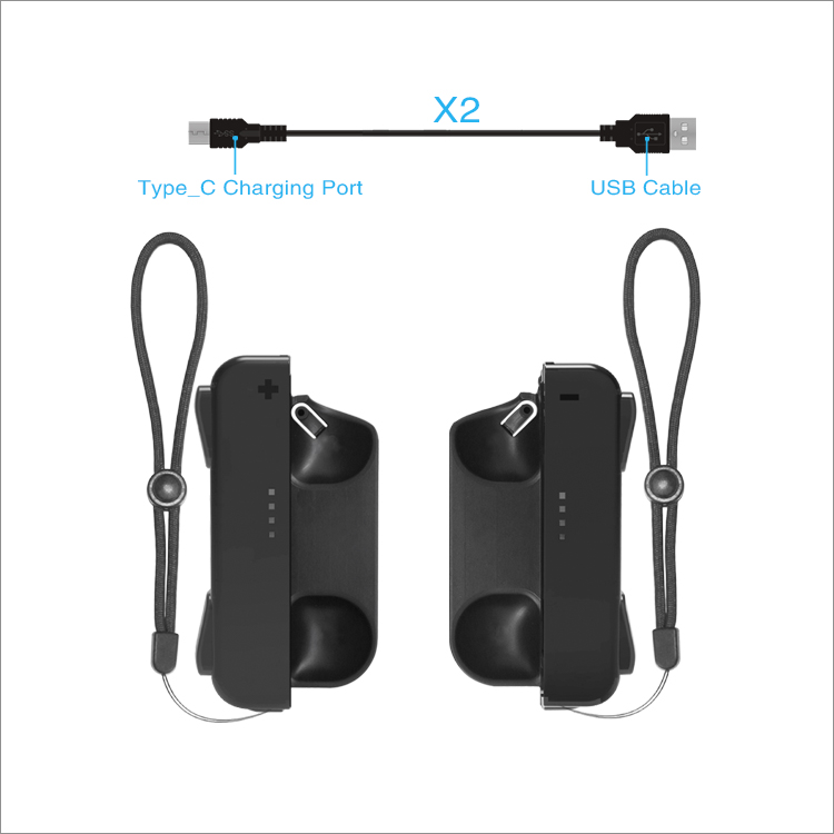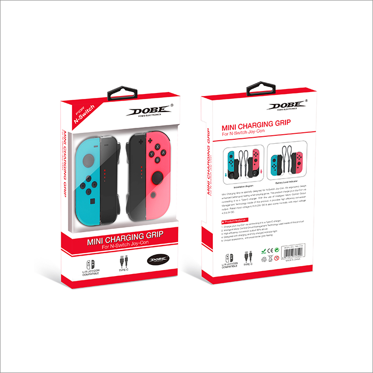 Switch迷你充电手把(升级版,含导光柱) 增强手感,并可给左/右小手柄充电,两个配套(左右)装于PET折盒中,包装内含手绳和充电线。