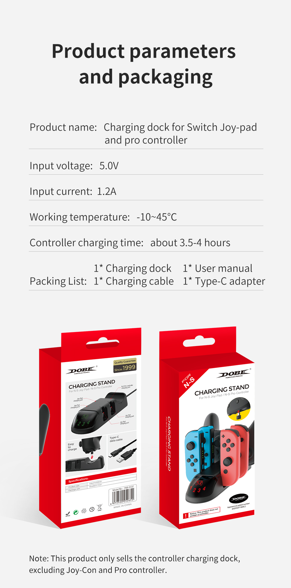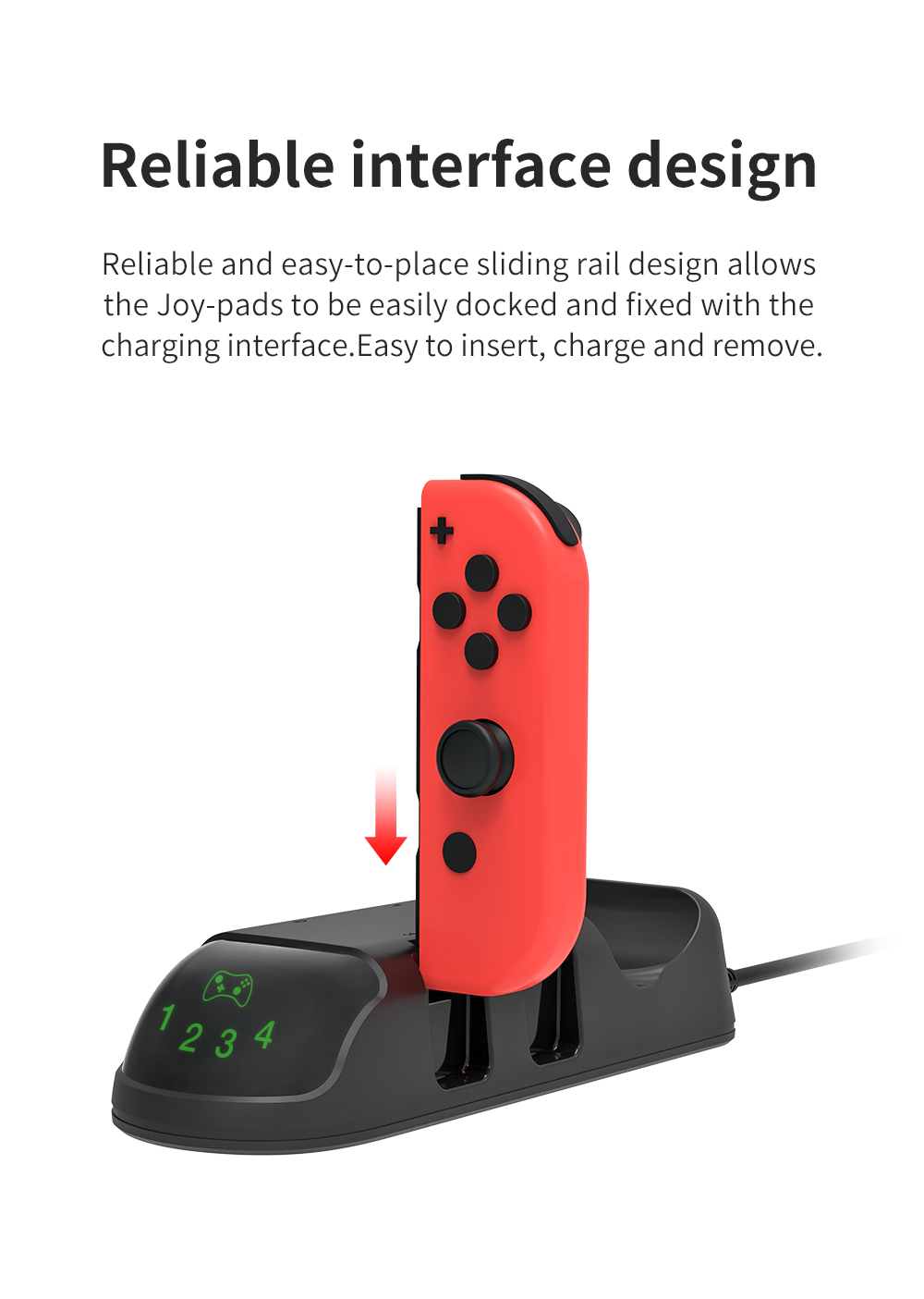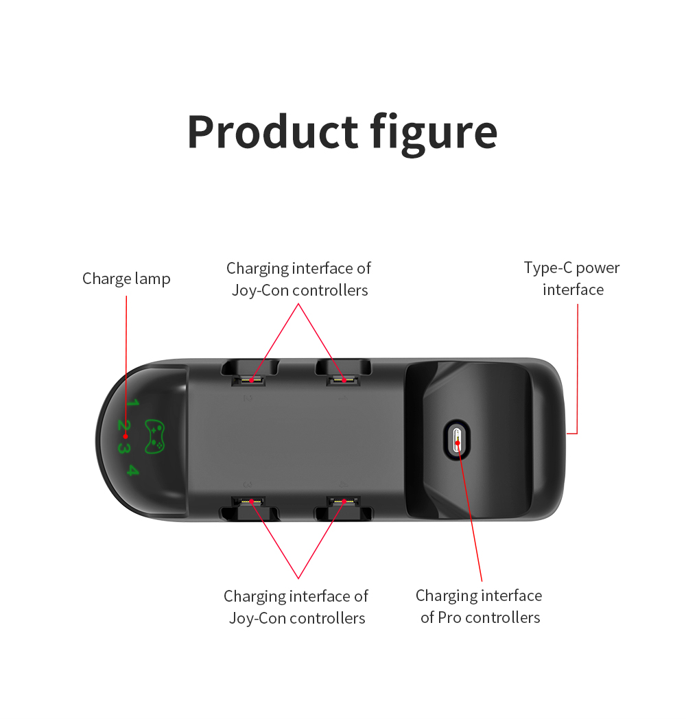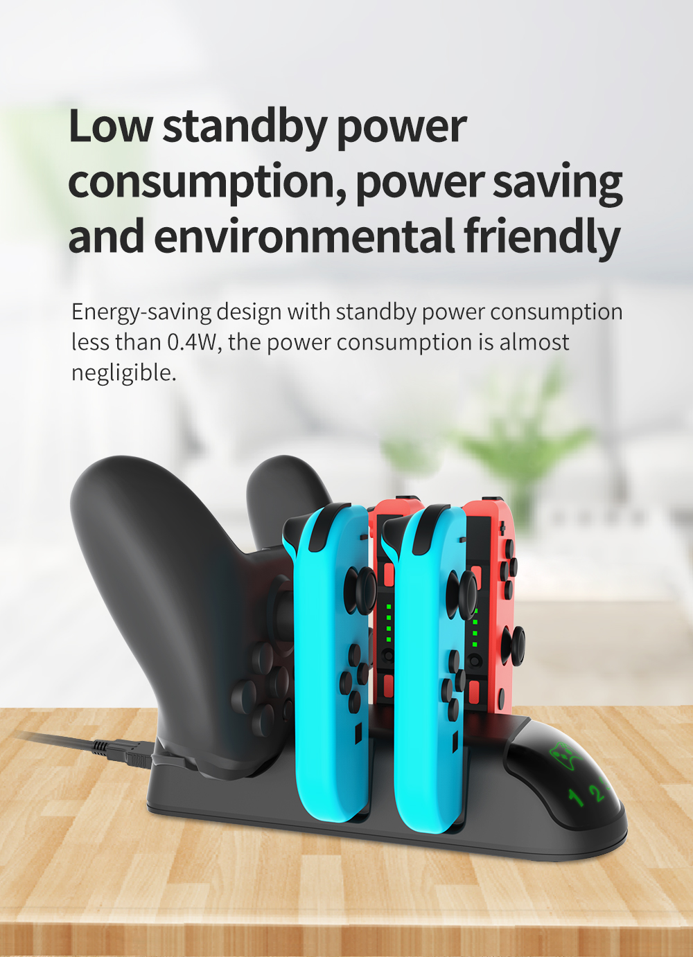 2. Four small controllers of Switch(JOY-Con)L/R and one PRO controller can be charged simultaneously;